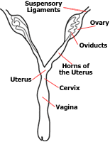 En la gráfica podemos ver, de abajo hacia arriba, la vagina, el cervix, e l útero, los cuernos uterinos, los oviductos, los ovarios y los ligamentos suspensorios.